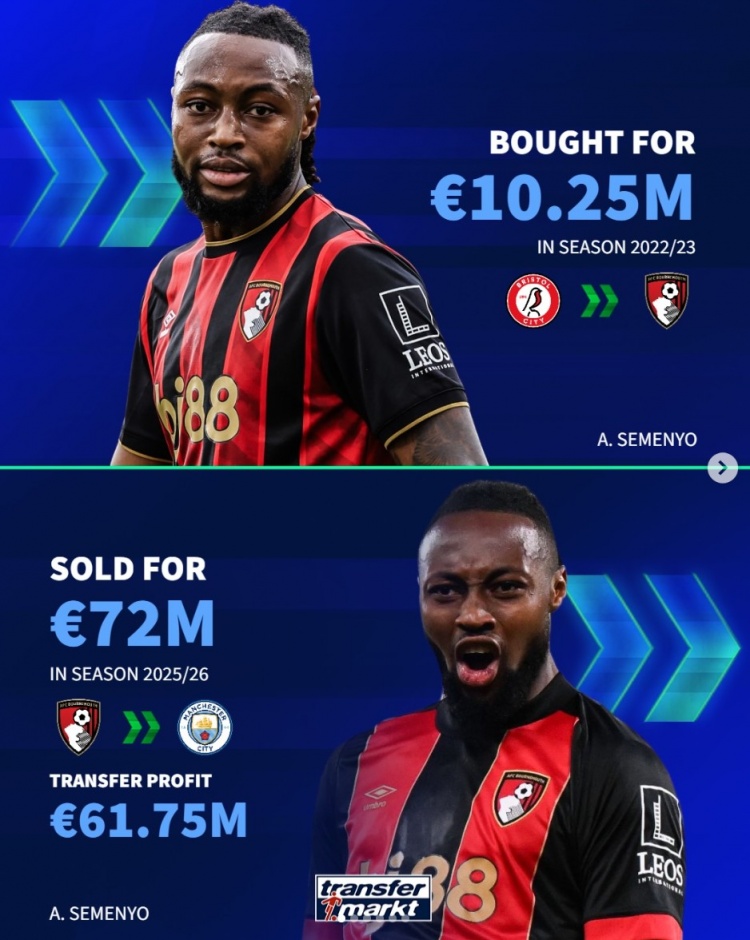 旺财28.com-伯恩茅斯近年盈利:塞梅尼奥+6175万,索兰克、赫伊森均超4千万