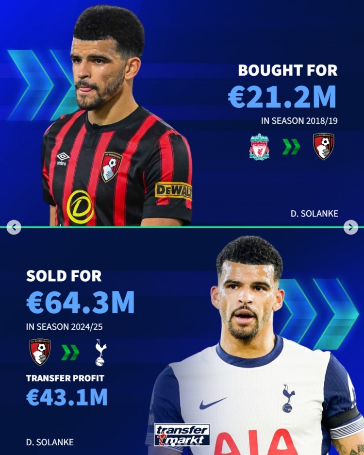 索兰克:2120万从利物浦引进,6430万出售给热刺,盈利4310万